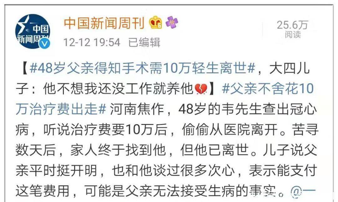 这位阿姨和丈夫从老家来东莞打工,日子本就过得紧巴巴。可丈夫突然重病住院,家里的积蓄很快见了底。那天她急着给丈夫交医药费,去银行取钱,却被扣除了27元异地手续费。这27块钱,成了压垮她的最后一根稻草。她不是心疼这27块钱本身,而是无力于这27块背后的无奈:连给丈夫救命的钱,都要被分走一笔;她拼尽全力想撑起的家,在现实面前脆弱得不堪一击。她蹲在地上哭的,是人到中年连一点风浪都扛不住的狼狈。这样的悲剧,每天都在上演。河南焦作一位48岁的父亲,被查出冠心病。手术并不复杂,费用约10万元。可他却在一个清晨,悄悄离开了医院。几天后,人们找到了他,却已天人永隔。后来才知道,他的儿子那时还在读大四。仅仅是因为不想拖累还在读书的孩子,他就选择了离开。